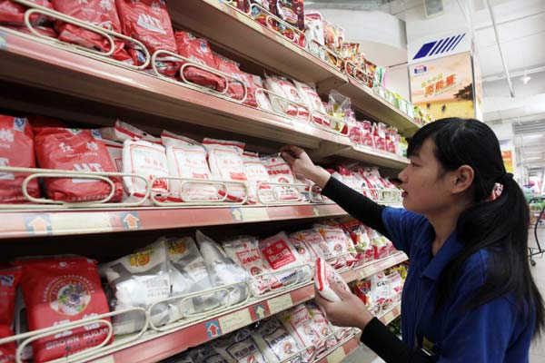 An employee puts bags of sugar on to shelves at a supermarket in Beijing. The price of the commodity has doubled in China since the beginning of the year. A QING / FOR CHINA DAILY
