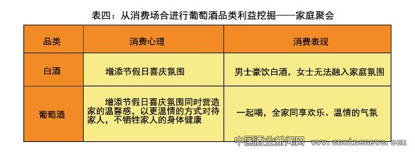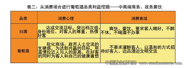 利益挖掘 通过和中原地区传统白酒做对比分析,我们不难发现,进口葡萄酒通过不同消费场合进行品类利益挖掘而体现的需求是很强劲的,并具有独特的产品优势(见表二、表三、表四、表五)。