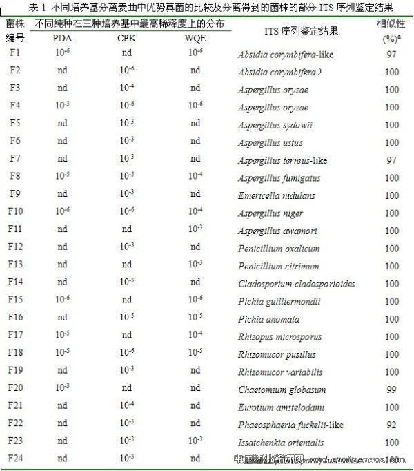 将10—5稀释度以上检测到的真菌认为是麦曲样品中的优势菌。从表中可以看出,不同的培养基分离出来的优势菌是不一样的,且每一种培养基都能检测到其它培养基所不能检测到的优势菌株,所以必须联合使用多种分离培养基,才能准确解析麦曲中的真菌多样性。另外,在分离培养基中有必要加入去氧胆酸钠来抑制菌丝的蔓延。