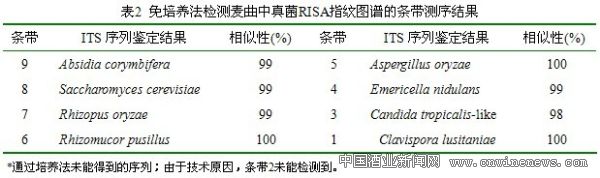 因此,为了更加准确的认识麦曲中的真菌群落结构,应该联合使用培养法和分子生物学技术。通过培养法未能得到的序列;由于技术原因,条带2未能检测到。