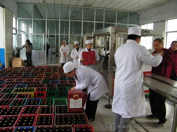 山东淄博齐长城酒业有限公司是以生产石榴酒为主要产品的企业,其产品由于很少受到季节的影响,因此在该企业的生产线上,一年到头都是工人们忙碌的身影。图为一线工人在灌装生产石榴酒。