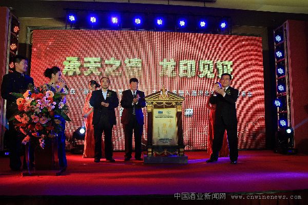 河北省商务厅副厅长仲继安(左一)、河北省文化厅副厅长边发吉(右一)、承德乾隆醉酒业公司董事长、总经理缪如焕共同为、板城龙印“千年金奖”奖牌揭幕。