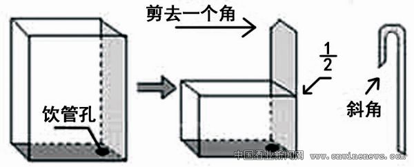 1、剪去一个空牛奶盒的底,再将盒体三个侧面剪去一半,留下靠近饮管口的一个侧面,并将它剪去一个角。将饮管口向下倒放,如图1。