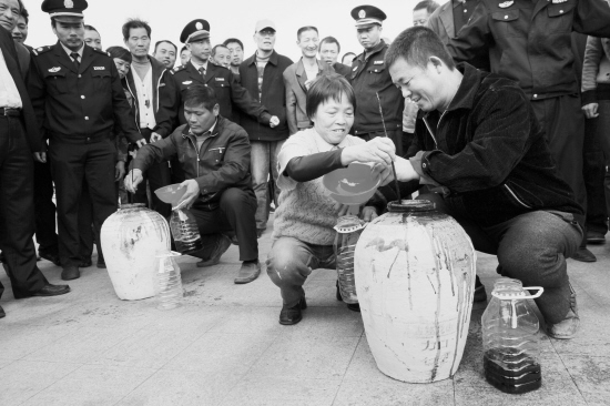 比赛之前,工作人员抬出了四坛黄酒,按照比赛规则,参赛选手从观众中随机产生,选手要将酒坛中的酒尽量快地吊到酒壶里,在1分半钟之内,谁的酒壶中的酒最多,谁就是胜利者,可以获得一瓶“库藏金五年”古越龙山绍兴黄酒。