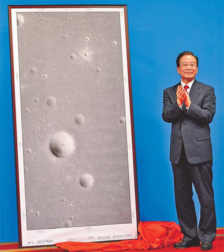 Premier Wen Jiabao unveils a photo of the moon's surface, taken by lunar probe Chang'e-2, in Beijing on Monday. The photo, one of a series of dramatic images, confirms the success of China's second lunar probe which was launched on Oct 1. Huang Jingwen / Xinhua
