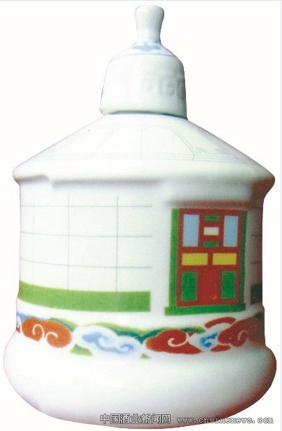 女儿去内蒙古时,带回一个蒙古包式的圆型酒瓶,瓶整体高17厘米,圆顶式瓶盖高5厘米,底部直径11厘米,底部一圆章中印有公司名称及酒瓶的专利号。瓶身溜肩,瓶壁上绘有
