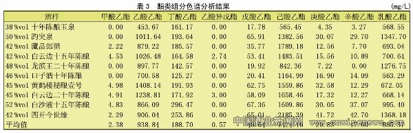 酯类是白酒香味的重要成分,在白酒中,除了水和乙醇之外,酯的含量占第三位。在酯的呈香呈味上,通常是相对分子质量小而沸点低的酯放香大,且有各自特殊的芳香。相对分子质量大而沸点高的酯类,香味虽然不强烈,却有极其幽雅的香气。己酸乙酯、乙酸乙酯、乳酸乙酯、丁酸乙酯、戊酸乙酯、庚酸乙酯是兼香型白酒中比较重要的酯类。几种具有代表性酒样酯类色谱分析结果见表3。