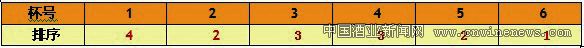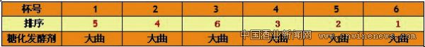 答案(见表3) 总分:54分。典型类型:汾酒大曲清香,6分;糖化发酵剂:大曲,6分;酿酒设备:地缸,6分;重现1=3、2=6、4=5,18分;排序:18分。
