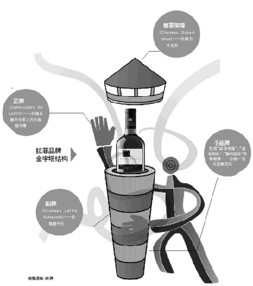 打高卖低,是惯用的营销技巧,葡萄酒奢侈品拉菲的策略也不例外。“对于成熟品牌而言,它们需要的就是快速消化与赢利。大拉菲动辄数万元,小拉菲也数千元,但是拉菲系列子品牌仅数百元的 价 格水平,子品牌无疑更适合中国塔尖下更广阔的中档葡萄酒市场,拉菲副牌的产值已经远超主品牌。”方军称。据了解,世界几大名庄酒除玛歌酒庄以外,都有多个品牌系列,而拉菲是开发中国二线市场动作最快的一个。“中国已是目前拉菲亚洲市场销售第一的国家。”拉菲出口部总监米歇尔曾经向记者透露。