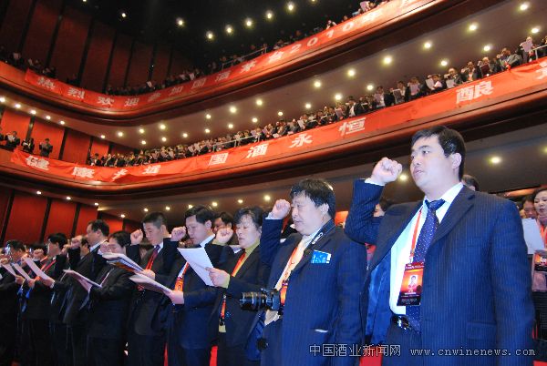 在茅台的经销商大会上,与会经销商代表们全体起立宣誓,和茅台企业一起捍卫国酒茅台的荣耀。
