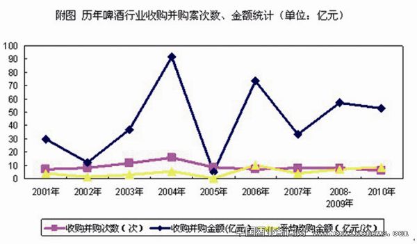“自2001年以来,国内啤酒市场发生了超过80次的收购行为,总金额超过400亿元,平均每年发生9起,每次金额约5亿元。”李保均告诉《华夏酒报》记者,“随着可供巨头收购的中小企业资源不断缩小,进入2011年后,啤酒行业的并购速度将有所放缓,并购过程中也不排除有中小企业互相结盟,采用合纵连横的方式共同抵抗巨头的强大攻势。”
