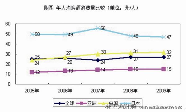 从人均啤酒消费来看,目前,我国人均消费量为32升,而2007年美国人均啤酒消费量就已达77升,西欧为127升。但是,我国人均啤酒消费量仍然有较大的增长空间。苏赛特商业数据有限公司董事长李保均认为,未来,随着我国城市化进程的加快以及二三线城市餐饮业的发展,啤酒的销量将进一步提升。
