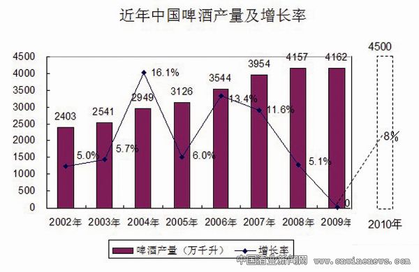 调查报告显示,近年来,中国啤酒行业产量呈现出较快的年均增长速度,从2002年的2403万千升增长到2009年的4162万千升。其中,2010年预计全年产量实现4500万千升,前三季度增长率达到7.2%,扭转了金融危机带来的增长率下降的趋势,重获升势。而从啤酒售价来看,近十年啤酒行业售价稳步上市,从2005年的2.39元/升,增长到2010年前8月的2.98元/升,售价在5元以上的啤酒已经占全部市场的26%。