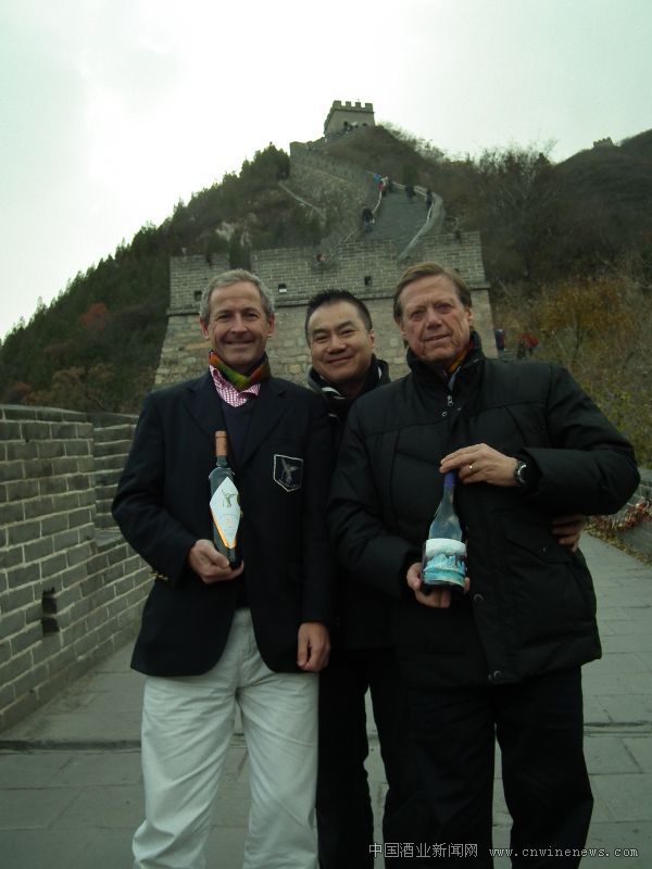 Montes酒庄总裁兼首席酿酒师Aurelio Montes(奥雷里奥·蒙特斯)(右一)、Montes酒庄出口总监Carlos Serrano(卡洛斯·赛拉诺)(左一)和北京洲际好年贸易有限公司总裁李志硕(左二)在长城合影留念。