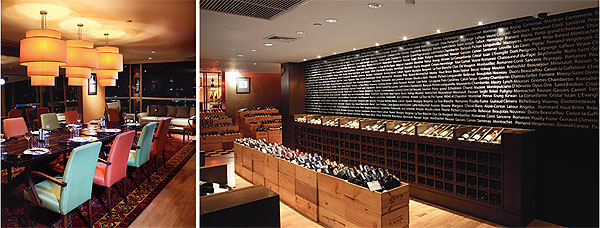 On any given evening, the extensive wine cellar that greets you as soon as you turn the corner from the elevator into the edgy red on black, faut paint-bespattered entrance, you can browse over 150 New and Old World wines from pretty much everywhere you can imagine.