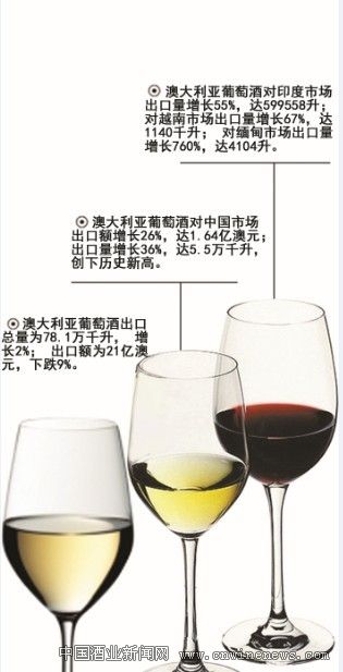 澳大利亚葡萄酒协会(Wine Australia)在2011年1月12日公布的年度葡萄酒出口报告显示,2010年,澳大利亚葡萄酒出口总量为78.1万千升,增长2%;出口额为21亿澳元,下跌9%。