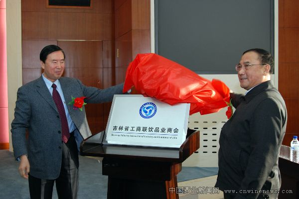 图为吉林省政协副主席、工商联主席别胜学(右)与吉林省委统战部副部长、工商联党组书记冀生(左)为商会揭牌。