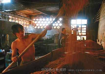 2.11蒸馏:地窖的酒醅量多,一般蒸馏采用截半酒醅的方法,一个窖池采用两甑蒸馏,并淋出黄水与第二甑蒸馏。在上酒醅时把分离的底糟摆在表面蒸馏,出甑时作丢糟。