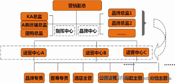 说明:营销副总统管营销、品牌经理负责制。根据品牌重要程度配置策略、调研、媒体人员。品牌经理负责产品品牌整体推广规划、重点市场目标下达、品牌传播管理、整体促销活动策划、市场推广进度的调查监督、市场投入预算管理。销售管理指挥中心直接对营销副总负责。指挥中心设重点渠道研究部门,包括KA、酒店终端、分销商终端、团购终端。区域市场设立运营中心,建立分渠道管理系统,负责完成各品牌在不同渠道中的铺货、启动指标。