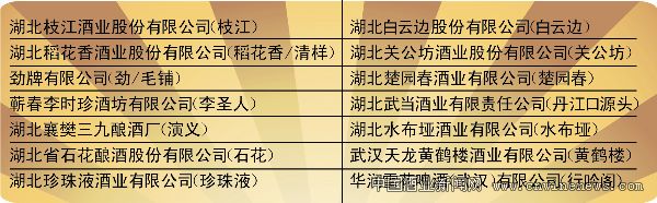 1月22日,2010年“品牌之光——湖北名牌暨国家地理标志产品颁奖典礼”在武汉举行,在上榜的209家企业的相关产品中,枝江、稻花香、劲牌等14家湖北酒企的相关产品入围(名单见下表)。