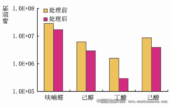 由于活性炭的极性基团的吸附力较强, 所以用活性炭处理白酒会降低酸的含量,对酒质造成影响。由图2 可知,经活性炭处理后的白酒中醛、酸、酯等物质含量降低比较明显。