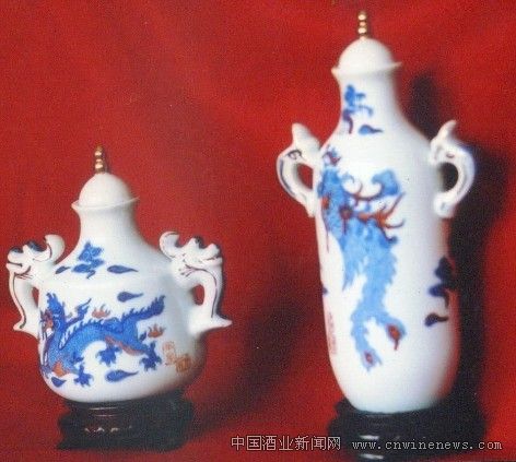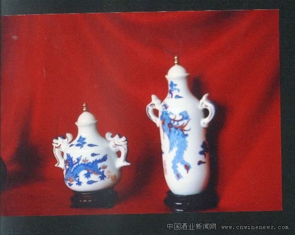 此对瓶由景德镇陶瓷大师赖德全先生设计和监制,用中国清代宫窖青花釉里红瓷技法加描金而制成。对瓶由皇帝酒和贵妃酒组成:帝皇酒瓶高16厘米,宽15厘米,瓶身扁平,矮而宽,折角柔和圆润、溜肩,上有祥云,青花龙耳描金,瓶身两面青花一条横游的整龙,龙头、龙身、龙尾在青花之上又施有红釉,整个龙形壮大,下文章来源华夏酒报颌突出,神态威猛,五爪伸出,仿佛在水中遨游;贵妃酒瓶高22厘米,宽8厘米,瓶身扁圆,折角秀美,青花凤耳描金,瓶身上一只直立的青花“凤”,其头、身、尾上施有红釉。在龙凤图案的下角,分别烧制有圆、方两方红色印章。两瓶瓶盖完全相同,葫芦形并施以金色,宛如清代官员的顶带、花翎。两瓶一矮一高、组合一对,矮的仿佛是帝皇端坐于龙椅之上,颇具王者风范;高的仿佛是贵妃侍立在君侧,高雅秀美。在瓶的底部,烧制有“中国(武汉)康龙集团”、“中国景德镇制”的两排青色字款,彰显出制瓶的精细和规范。此对瓶色调亮丽,纹饰清皙,青红相互辉映,美观绮丽,加上瓶盖、瓶身上的描金以及红木底座,更是锦上添花。