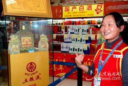 记者在超市内看到,这瓶五粮液摆放在一个特别设置的豪华玻璃柜内,瓶形是一个硕大的四方瓶,周围分别摆放着2个精巧的小酒瓶。透过瓶子看里面的酒,瓶壁上依稀能看到点缀着的零星金黄色泽,一旁的《五粮液原浆出厂证明书》标明,该瓶五粮液为70度原浆金酒,净含量4000毫升。据酒柜销售员介绍,这种高价五粮液整个云南沃尔玛店一共有8瓶,玉溪仅此一瓶,去年春节期间也有一瓶五粮液标价48000元,最后还是被顾客买走了。