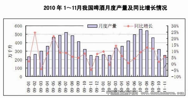 据统计,2010年1月—11月,中国啤酒行业累计产量4239.89万千升,同比增长6.5%,增速与2009年同期持平,中国啤酒产量有望连续9年蝉联世界第一位。其中,三大巨头雪花、青岛和燕京的产销量分别为928万千升、635万千升和503万千升,增长率分别为10.9%、7.4%、7.7%;雪花距离千万升目标仅有一步之遥,燕京首次突破500万千升,实现了“十一五”的既定目标;三大巨头占全国产销量近一半。