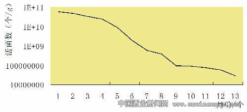 而短期贮存的干曲(不超过3个月),其曲香味正,水分小,麸色鲜亮,菌种数量多,糖化力、发酵力较高,在生产使用上效果也不错。若贮存期过长(6个月以上),曲色黯淡无光泽,曲香味淡,有邪杂味产生,活菌种数量减少,糖化力、发酵力较低,应慎重使用。通过镜检、化验分析等验证,贮存时间对活性菌数量的影响,见表3。