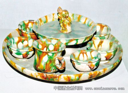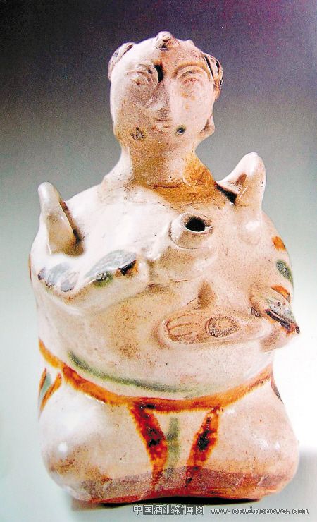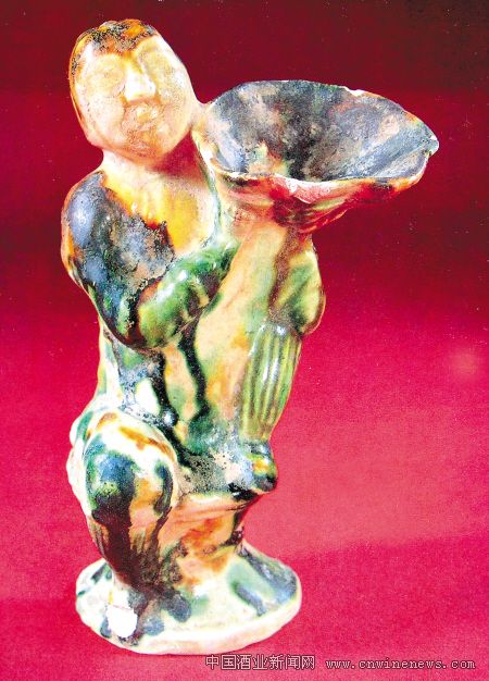 在唐三彩中有一类体量较小的胡人抱囊壶,在唐代两京长安和洛阳均有出土。以洛阳博物馆馆藏两件为例,如1957年洛阳市吕庙出土的一件唐三彩抱囊壶,曾被定名为“女俑持荷叶造型灯座”,被认为是俑内盛油,在壶口位置另放灯盏,这种说法显然有误;洛阳博物馆另有一件胡人抱囊小壶,1976年河南孟津周寨出土模印制作的唐三彩胡童也抱着鹅雁形囊,它与盛唐时期文章来源华夏酒报常见的七子盘(或称母子盘、七星盘)一同出土,可知其原始用途可能与唐代胡人献宝或献酒的习俗有关。