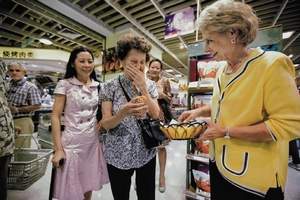 Washington Gov. Chris Gregoire (right) gives a sample of Washington-made french fries to customers at a Shanghai store. / AP file |