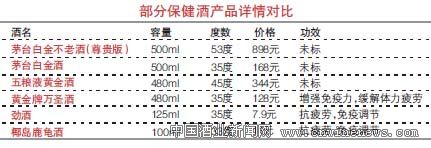 此外,频频曝出的虚假宣传消息也让消费者对保健酒的功能提出质疑。据了解,茅台白金酒一直宣传“融入18味纯天然草本植物药材”,但国家药监局网站上的相关信息则显示,这款酒主要原料为白酒、红参、当归、罗汉果、枸杞、黑芝麻、红花、大枣、肉桂、桑葚和桂圆,共10味药材,由此引发了茅台白金酒隐瞒8味药材,涉嫌违规宣传的质疑。