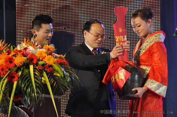 工作人员为汪峰献上古井贡酒年份原浆26年(张珩摄)