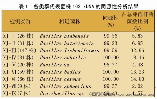 除芽孢杆菌属菌株之外,还分离出极少量的Brevibacillus的不确定种菌株,占已分离总芽孢杆菌菌数的1.57%。