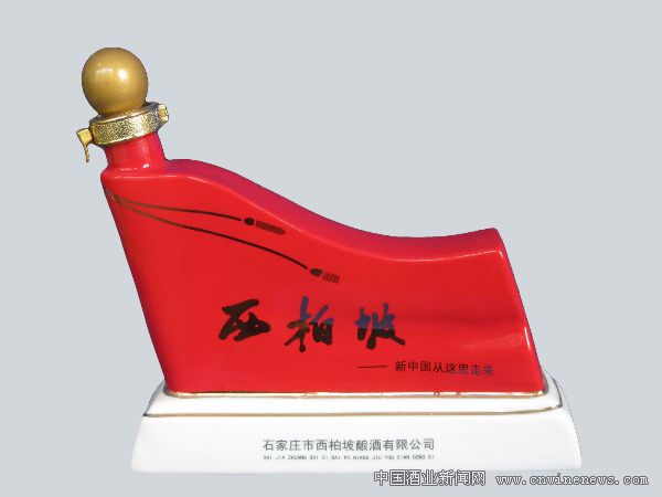 画册中的每个酒瓶都值得人们细细品味。我翻到画册的第6页,一座红旗造型的雕塑瓶映入我的眼帘,瓶外施中国红釉色,鲜艳靓丽,迎风招展,动感很强。旗正面是“西柏坡”3个大字,下排印着“新中国从这里走来”8个小字,仿佛象征着革命的胜利,是一尊极具河北特色的红色酒器。看着红