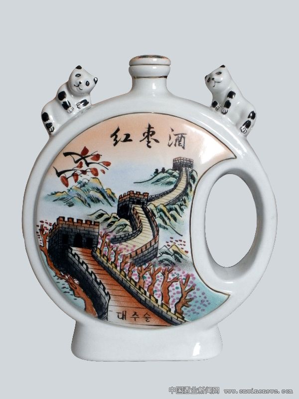 画册第168页的“红枣酒”瓶,是一尊扁圆体造型瓶,瓶身用立体和平面两种装饰手法。立体是指瓶肩两侧装饰有国宝熊猫,黑白相间的皮毛,憨态可掬的形象,讨人欢心,加上平面装饰的粉彩长城图案,延绵逶迤,雄伟壮观,在重叠的山峦旁一棵大枣树伸出,上面长满了成熟的大红枣,令人垂涎,而瓶身右侧的一处镂空形同一棵大枣,既增加了瓶的立体之美又自然形成壶把。