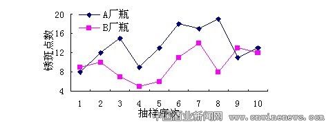 啤酒瓶口外缘成型结构和光滑程度是影响部位A锈蚀的重要因素。按国标规定,啤酒瓶外口径标准为26.3mm—26.9mm。模缝线要求:尖锐刺手的不允许有,凸出量不大于0.5mm,初型模缝线明显的不允许有。但对瓶口水平模缝线的位置没有作出明确的规定,因此,不同厂家生产的啤酒瓶压盖后锈蚀情况有不同。由图3可见,B厂瓶所产生的盖内锈蚀斑点平中国酒业风向标华夏酒报邮发代转于cnwine来源中国华夏酒报:邮发代号23-189 当地邮局可订阅酒业新闻网news.com号23-189当地邮局可订阅均值较A厂略低。通过对瓶口统计观察发现,B厂瓶唇部均能看到水平模缝线,即这些瓶不易造成盖内A部位锈蚀。