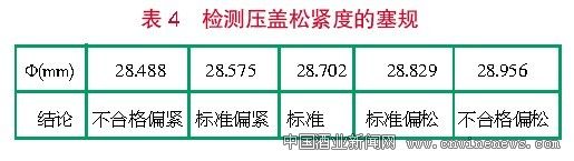 如前文所述,压盖将导致部位A、部位B存在不同的损伤,使瓶盖钢基暴露于空气中而引起锈蚀。实践表明,灌装机压盖时瓶盖的气密性直接影响瓶盖压痕的严重性和对部位A、部位B破损程度,从而直接影响到生锈情况。压盖松紧度由塞规检测,见表4。