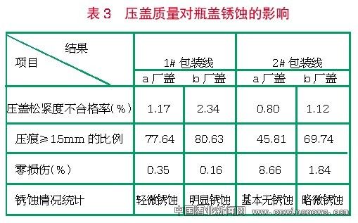 表3统计的是两包装线压盖质量对瓶盖锈蚀影响的结果。可以看出,同盖不同生产线及同生产线不同盖所表现的锈蚀情况是不同的,同时也说明了压盖松紧度和压痕损伤比例均对瓶盖锈蚀产生重要的影响。生产中必须在两者之间找到平衡点,同时保证压盖机的性能可靠。