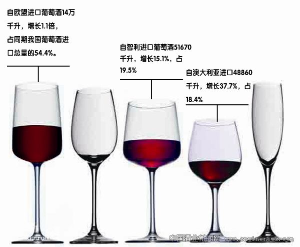 据悉,2010年1月—11月,国内进口的葡萄酒主要来自欧盟,而且增长迅猛。2010年1月—11月,我国自欧盟进口葡萄酒达14万千升,增长1.1倍,占同期我国葡萄酒进口总量的54.4%。同期,我国自智利进口葡萄酒51670千升,增长15.1%,占进口总量的19.5%;自澳大利亚进口葡萄酒48860千升,增长37.7%,占进口总量的18.4%。