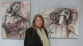 Fortunately, the painter was at hand and was pleased to explain to me about her work and the ¡®eno-art¡¯ she had created. ¡®It took a long period of research and experimental work, involving the University of Florence before I could develop the wine-made paintings,¡¯ she said Most comfortable with oil and canvas and blue denim, she had used only a bit of charcoal for the main lines of this style of paintings. She uses only white and red wine with no additives or chemical components. ¡®Such combination allows the wine to reproduce on the canvas exactly the same process of ageing that normally takes place inside the bottle,¡¯ she says.