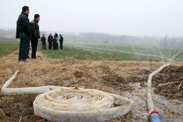 2月21日,河南文章来源华夏酒报内乡县马山镇用水协会的农民利用喷灌设备抗旱浇麦。