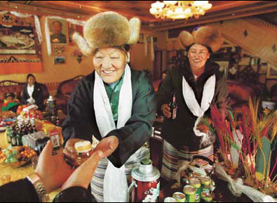 Chonda serves highland barley wine for the guests after singing songs with other women. [China Daily]