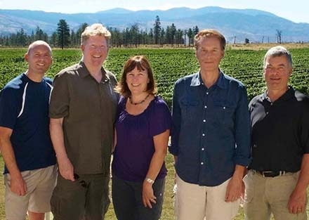 Okanagan Crush Pad Winery benefits from the expertise of winemaker Michael Bartier (left to right), advisor David Scholefield, partner Christine Coletta, consulting winemaker Alberto Antonini, partner Steve Lornie.