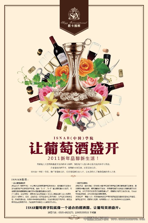 葡萄酒您一定品过不少,在品味这种时尚、健康饮品的时候,有没有想过,您也可以从事高薪、高雅的葡萄酒工作,或者成为葡萄酒达人呢?如今由中国农业大学(烟台)、法国波尔多自然与农业食品科学学院(ISNAB)和西卡国际合作成立的ISNAB(中国)学院,作为国内首家培育侍酒营销师的葡萄酒教育机构,开设了“3+3”、“1+3”留法学历项目、侍酒营销师班、法国ISNAB侍酒师证书班、酒类EMBA总裁班、企业培训等课程,可以把不懂酒的人带进葡萄酒世界,让懂酒的人更上一层楼。