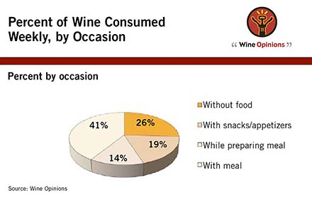 Napa, Calif.—A new survey of top wine drinkers contradicts industry assertions that most wine is drunk with food. The study of high-frequency wine drinkers by Wine Opinions reports that while an average of 41% of wine is consumed with meals, the majority—59% —is not, at least among avid wine drinkers.