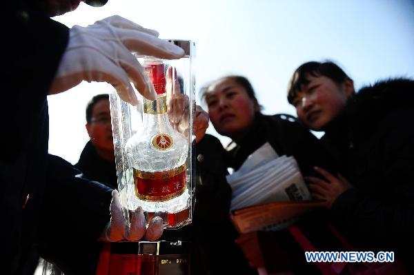 A staff member of local industrial and commercial administration explains the method to identify the genuine and counterfeit wine during an activity in Xining, capital of northwest China's Qinghai Province, March 15, 2011. A variety of activities were held across the country to greet the International Day for Protecting Consumers' Rights on March 15. (Xinhua/Zhang Hongxiang)