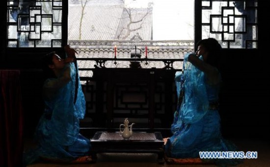 Girls perform alcohol ceremony in Chengdu, capital of southwest China's Sichuan Province, in March 19, 2011. (Xinhua/Jiang Hongjing)
