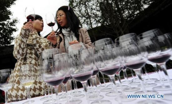 A sommelier (L) exchanges information on wine tasting with a visitor in Chengdu, capital of southwest China's Sichuan Province, in March 19, 2011. (Xinhua/Jiang Hongjing)