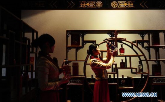 Girls display bottles of vintage Chinese liquor in Chengdu, capital of southwest China's Sichuan Province, in March 19, 2011. (Xinhua/Jiang Hongjing)